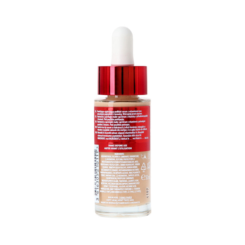 BOURJOIS Healthy Mix Serum is an innovative foundation that combines the care properties of a serum with the coverage effect of a foundation. Thanks to its light, silky consistency, it provides a natural finish and comfort of wear throughout the day. The formula enriched with vitamins C, E and B5 and cranberry extract supports skin hydration, improves its elasticity and gives a healthy glow. After 6 hours from application, the skin's hydration level increases by 50%.