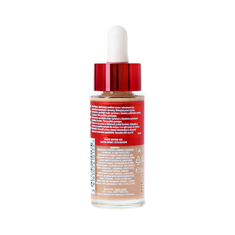 BOURJOIS Healthy Mix Serum is an innovative foundation that combines the care properties of a serum with the coverage effect of a foundation. Thanks to its light, silky consistency, it provides a natural finish and comfort of wear throughout the day. The formula enriched with vitamins C, E and B5 and cranberry extract supports skin hydration, improves its elasticity and gives a healthy glow. After 6 hours from application, the skin's hydration level increases by 50%.