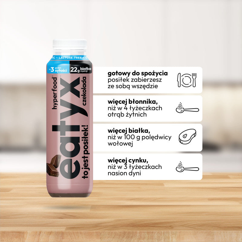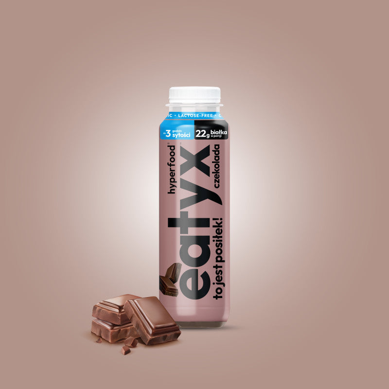 Pełnowartościowy posiłek w płynie o smaku czekoladowym, dostępny w praktycznej butelce 300 ml. Bezglutenowa i bezlaktozowa formuła dostarcza witamin i minerałów, 22 g białka, błonnika oraz starannie zbilansowanych tłuszczów i węglowodanów. Zapewnia sytość nawet do 3 godzin i wyróżnia się niskim indeksem glikemicznym. Napój eatyx stanowi wygodny zamiennik tradycyjnego posiłku, a przy tym wspiera kontrolę wagi i utrzymanie smukłej sylwetki. Świetnie sprawdzi się w pracy, na siłowni czy w trakcie aktywnego dnia poza domem.