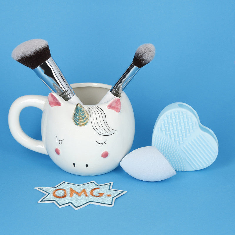 The Out Of The Blue set consists of two functional contouring brushes. You can apply not only bronzer and highlighter, but also use them for applying to other powdered cosmetics. The resilient sponge is perfect for applying foundation, concealer and powder and the blue heart-shaped cleaner is the perfect addition to the set.
