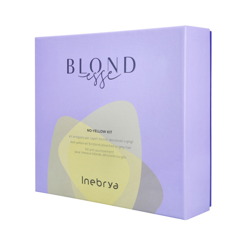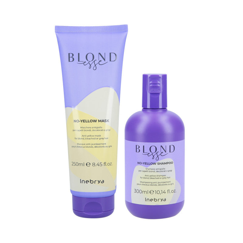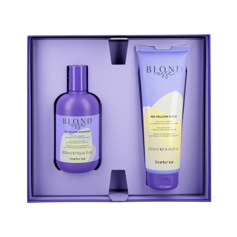 The Inebrya No Yellow set contains a shampoo and mask for blonde, lightened and gray hair that needs to tone down and neutralize yellow tones.