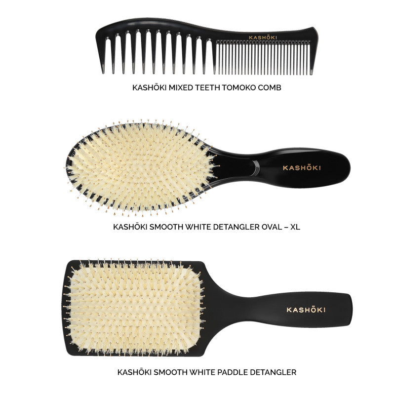 - Kashōki Smooth White Detangler – Large Oval Brush – with white natural boar bristles and nylon pins. Ideal for detangling long and thick hair.