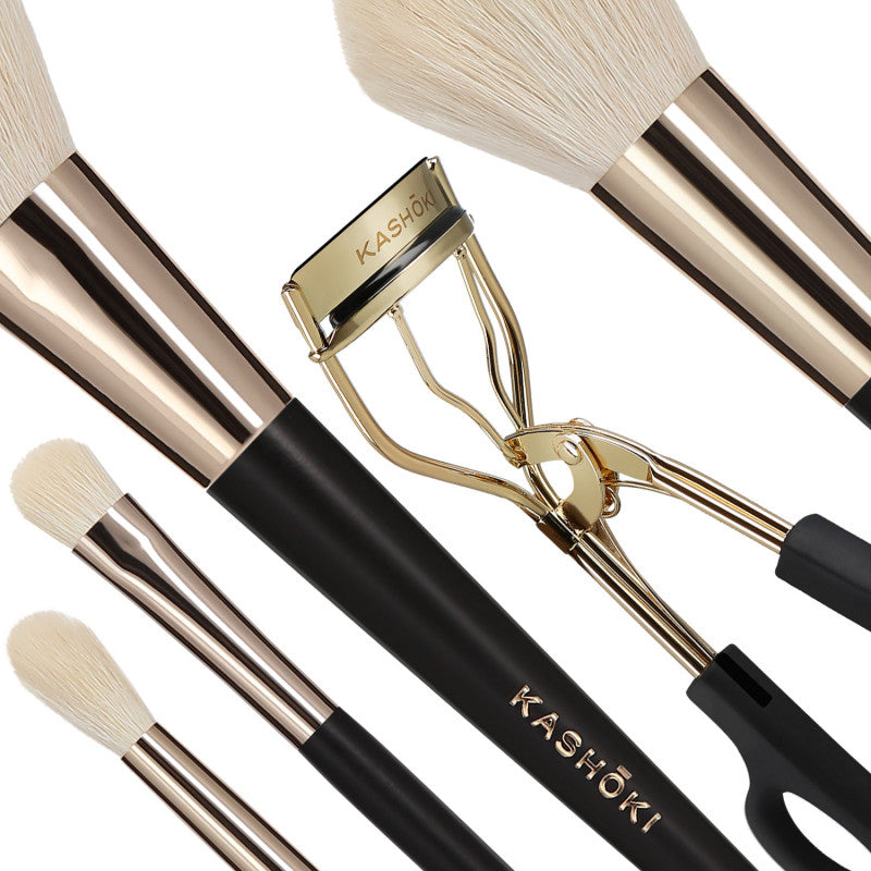 Kashoki makeup brushes and accessories are items with a sophisticated design, created from the best materials. The set includes 4 makeup brushes with high-quality bristles, copper caps and schima handles and an eye curler
