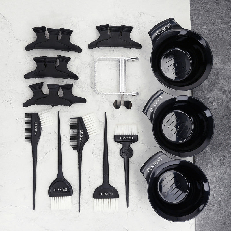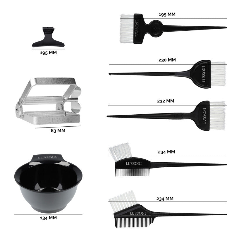 The set of 10 Lussoni accessories contains everything you need for professional coloring. It consists of mixing bowls, brushes for applying paint, hairdressing clips and tube squeezer.