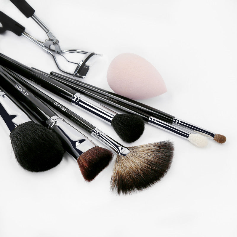 All the accessories are made of the highest quality materials to meet the requirements of professionals. Brushes have shaped bristles, wooden handles and copper caps. The eyelash curler has a reliable mechanism and fits all eye types. The sponge has a universal drop shape and is made of a latex-free material. They all ensure an even application of cosmetics.