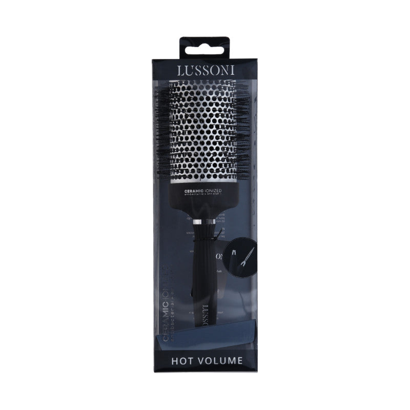 The Lussoni hot volume styling hairbrush was created to meet the needs of every professional who uses styling hairbrushes. At the design and production stage, we cooperated with hairdressers and hair stylists to ensure that every detail was refined to perfection. The round ventilated design with a diameter of 65mm helps dry hair faster. The waved bristles effectively protect hair from damage and accelerate the styling of long and very long hair. The antistatic, ionizing and antibacterial properties of the ceramic coating allow for a faster and even heat distribution making it resistant to very high temperatures up to 220 degrees Celsius. Its removable pin allows easy separation of hair strands and compartments.