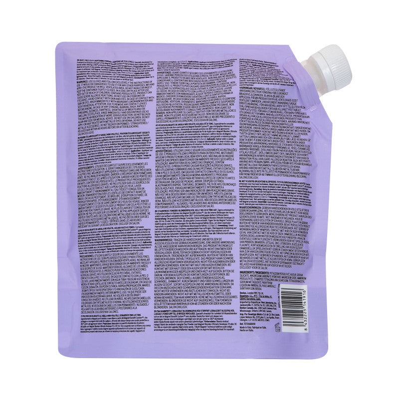 How to use: Mix the appropriate amount of lightener with Magnet Blondes Ultimate Developer (20 or 30 Vol.) in a ratio of 1:1.5 to 1:2, until a smooth consistency is obtained. Apply the mixture to dry, unwashed hair, using free-hand techniques. Leave on for up to 45 minutes, regularly checking the process every 5 minutes.