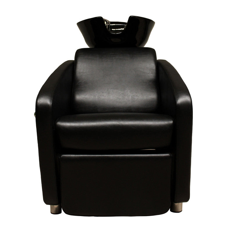 Luxor is a functional washbasin with a footrest, suitable for people of all height. The backrest of the washbasin is anatomically shaped, so that the customer obtains a particularly good posture. The mechanically lifted footrest completes the pleasant moment of relaxation. The tilting ceramic washbasin and stylish chrome legs facilitate the work of the hairdresser. The smooth black arelan upholstery is resistant to dirt. The washbasin is available with a traditional tap and an anti -drop shower system. The water parts are certified by the EU.