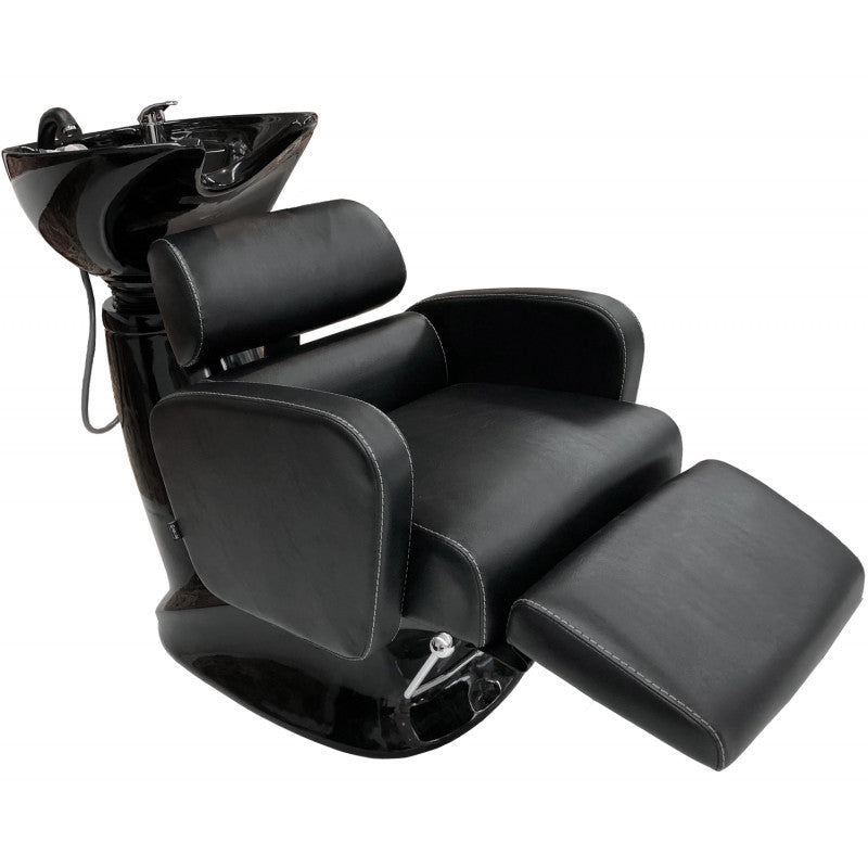 Flex washbasin is compact and ideal for rooms of many sizes. The flexible Sakai Re - Flex backrest guarantees your client the best possible sitting position! A mechanically lifted footrest increases the client's comfort during the procedure. There is a choice of a ceramic washbasin in black or white. The upholstery is made of arelan , which is very durable to use and clean. The product is available with a traditional faucet and an anti -drop shower system. The water parts are certified by the EU.