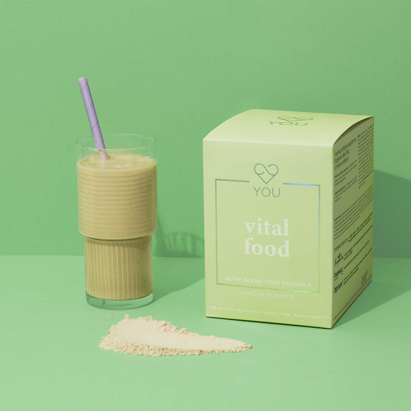 YOU VITAL FOOD NUTRI BLEND VEGE PROTEIN FORMULA is more than just a vegan protein supplement with no added sugar. It contains protein ( pea protein isolate ) that supports the development and maintenance of muscle mass, oat flour for balanced energy, coconut oil with nutritional properties, acerola fruit extract , and patented ingredients such as: Probiostress®zen (stress reduction and improvement of sleep quality), Shagandha ® (stress level reduction), Inavea ™ ( prebiotic properties and high digestive tolerance), Diphorm ® (rich source of omega-3 acids).