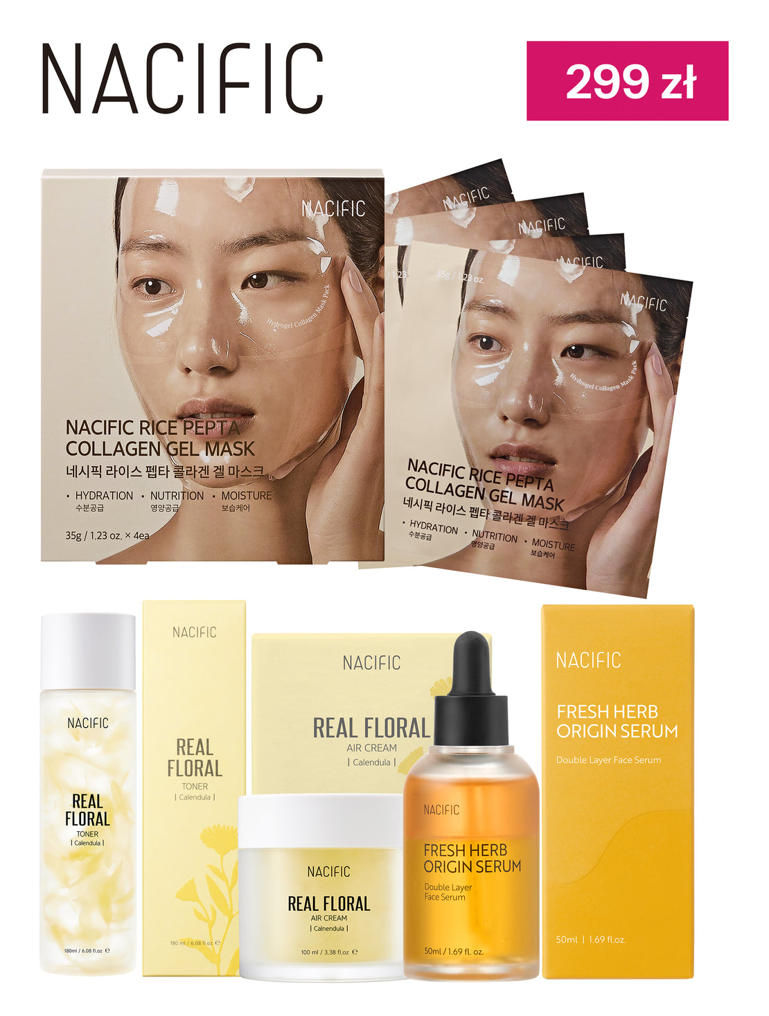 Zanurz się w koreańskim rytuale pielęgnacyjnym z zestawem Nacific. Delikatne formuły oparte na ekstrakcie z nagietka, kolagenie i naturalnych ziołach