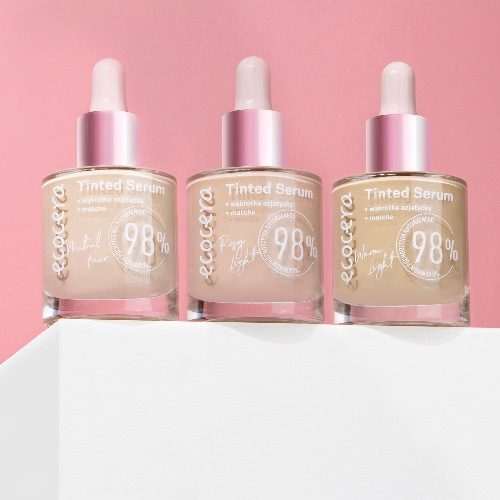 Tinted Serum to innowacyjne połączenie makijażu i pielęgnacji. Aż 98% składników pochodzenia naturalnego sprawia, że produkt nie tylko nadaje cerze piękny wygląd, ale także wspiera jej kondycję. W formule znajdziesz m.in. CICA, czyli ekstrakt z wąkrotki azjatyckiej, która wspiera procesy naprawcze skóry, oraz matchę – bogate źródło antyoksydantów, które chronią przed wolnymi rodnikami i oznakami przedwczesnego starzenia.