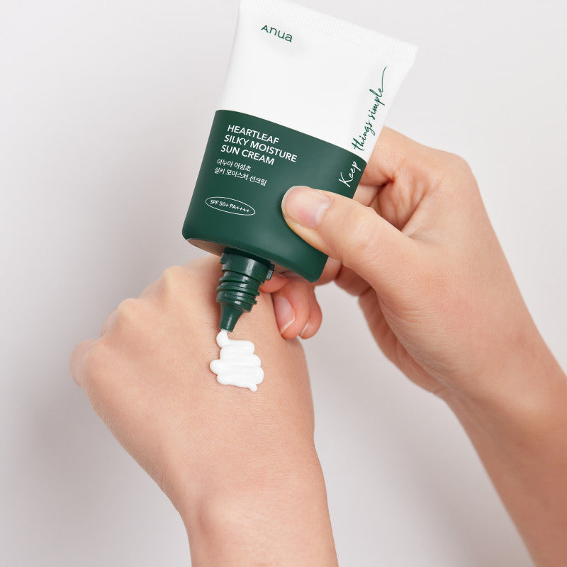 ANUA Heartleaf Silky Moisture Sun Cream to lekki, wegański krem przeciwsłoneczny, który łączy wysoką ochronę SPF50+ PA++++ z intensywnym nawilżeniem i działaniem kojącym. Dzięki zawartości 30% ekstraktu z Houttuynia Cordata (pstrolistka sercowata), niacynamidu i pantenolu, produkt łagodzi podrażnienia, redukuje zaczerwienienia oraz wspiera regenerację skóry. Jego nietłusta, żelowa formuła szybko się wchłania, nie pozostawiając białych śladów ani uczucia lepkości, co czyni go idealnym wyborem dla skóry wrażliwej, mieszanej i tłustej.