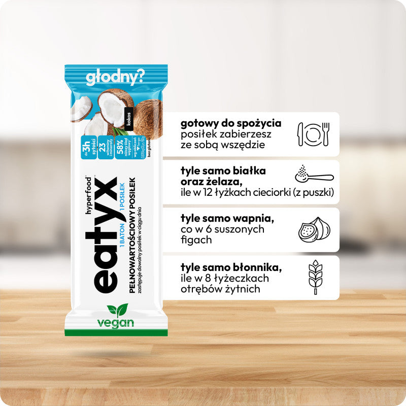 Pełnowartościowy, wegański, bezglutenowy posiłek w formie batona o smaku kokosowym. Wspomaga utrzymanie sylwetki i kontrolę wagi. Źródło białka, błonnika, 23 witaminy i minerały. Bez dodatku cukru.