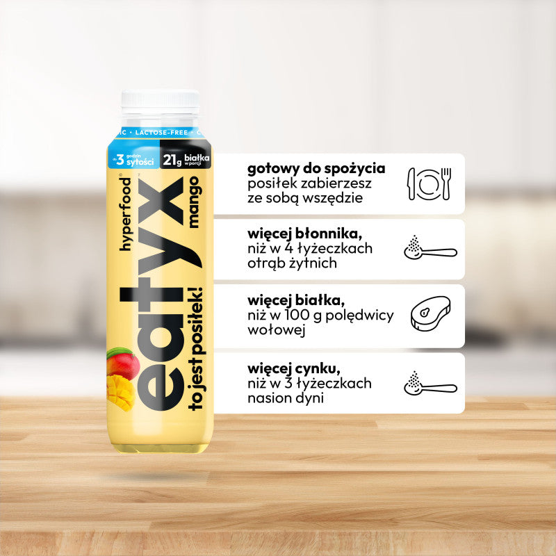 Eine komplette Flüssigmahlzeit mit Mangogeschmack, verpackt in einer praktischen 300-ml-Flasche. Glutenfrei und laktosefrei Rezept liefert Vitamine und Mineralstoffe, 21 g Protein, Ballaststoffe und richtig ausgewogene Fette und Kohlenhydrate. Es sorgt für ein Sättigungsgefühl von bis zu 3 Stunden und zeichnet sich zudem durch... niedriger glykämischer Index. Das eatyx-Getränk ist eine praktische Alternative zu einer herkömmlichen Mahlzeit und hilft dabei, das Gewicht zu kontrollieren und eine schlanke Figur zu bewahren. Perfekt zum Mitnehmen zum Training, zur Arbeit oder an einem aktiven Tag außer Haus.