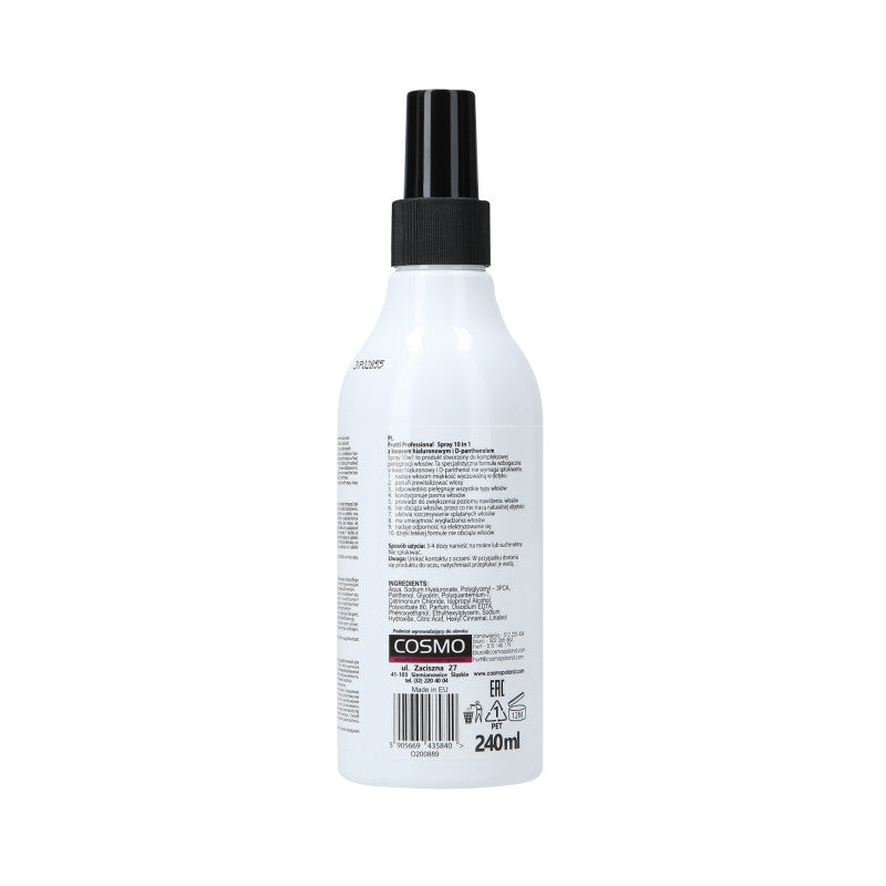 Wielozadaniowa odżywka w sprayu 10w1 marki FRUTTI PROFESSIONAL to kompleksowa pielęgnacja włosów bez konieczności spłukiwania. Formuła wzbogacona o kwas hialuronowy i D-pantenol intensywnie nawilża, odżywia i wygładza włosy, przywracając im zdrowy wygląd i naturalny blask. Produkt jest odpowiedni dla każdego rodzaju włosów, szczególnie tych suchych, zniszczonych i trudnych do ułożenia.