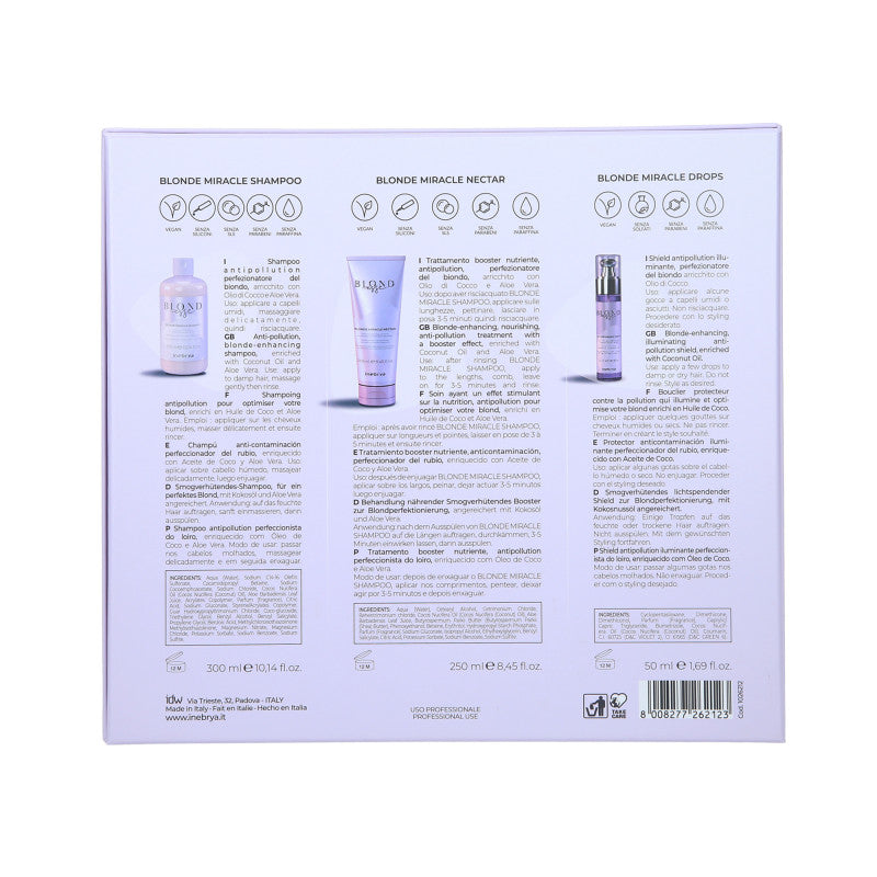 Zestaw Inebrya Blondesse Blonde Miracle Kit to kompleksowa pielęgnacja przeznaczona dla włosów blond, rozjaśnianych i z pasemkami. Produkty wchodzące w skład zestawu — szampon, maska i serum — zostały opracowane z myślą o nawilżaniu, ochronie koloru i intensywnym wygładzeniu. Ich wegańska formuła opiera się na odżywczych składnikach, takich jak olejek kokosowy, ekstrakt z wanilii oraz jagód acai, które wspólnie działają regenerująco, rozświetlająco i ochronnie. Zestaw niweluje żółte tony, poprawia elastyczność włosów i nadaje im jedwabistą miękkość.